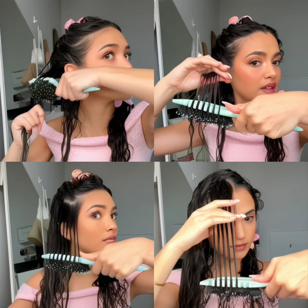 Commencez par des boucles humides et votre produit préféré. Brossez lentement vers le bas, et vous verrez vos boucles se transformer instantanément en mèches lisses et brillantes. C'est facile et étonnamment satisfaisant.
